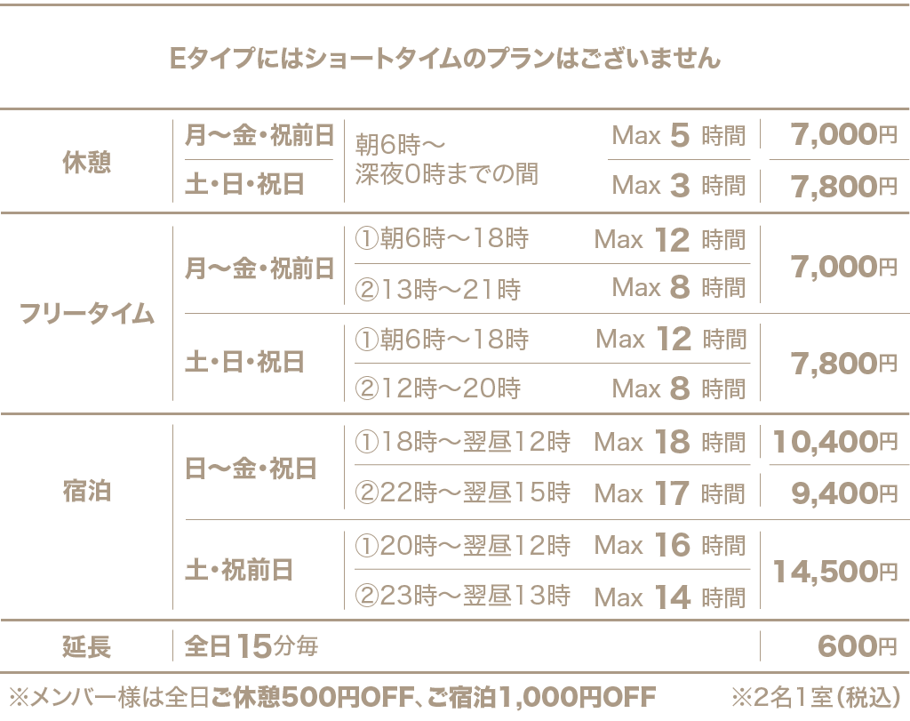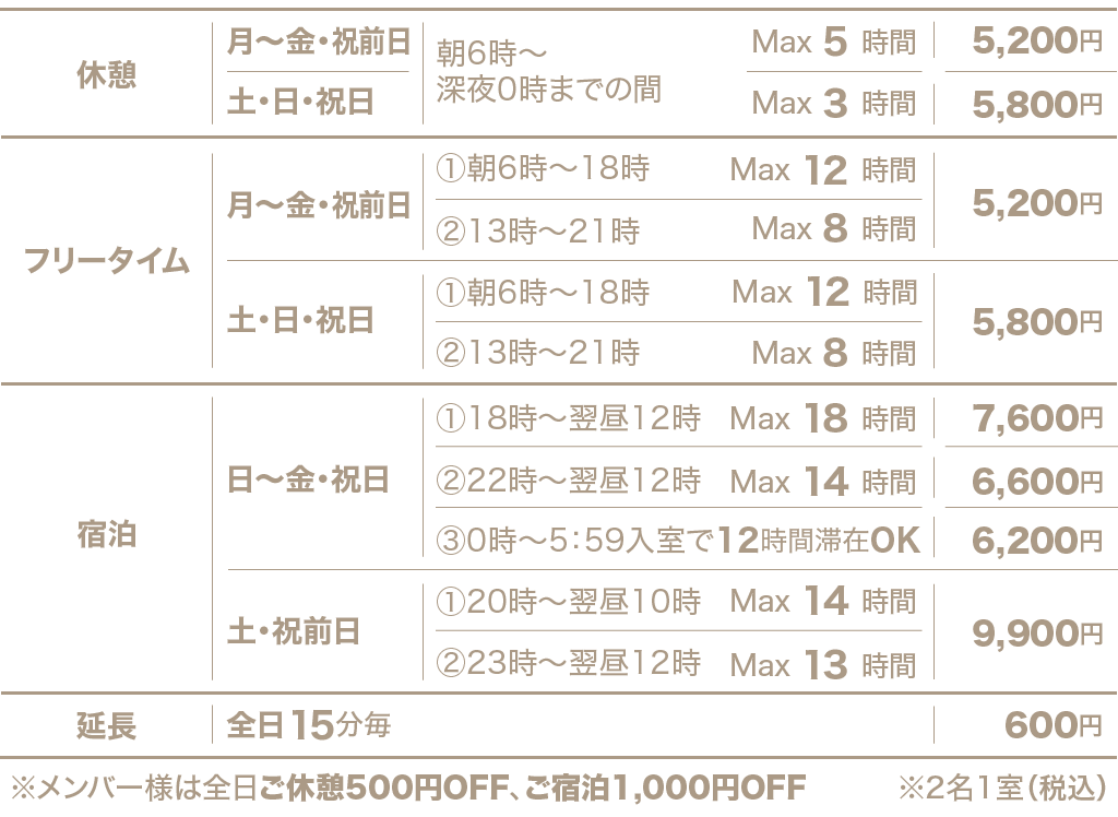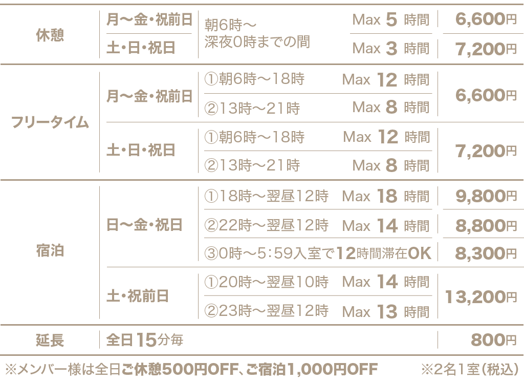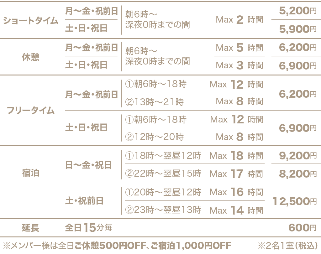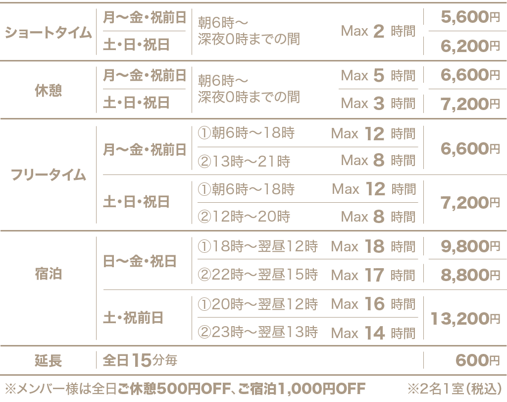 ※連休・クリスマス・年末年始・G/W・夏休み・お盆期間等の特別期間は料金システムが異なります